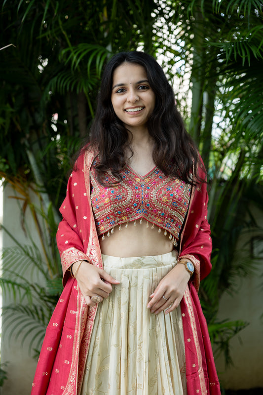 Regular price Rs. 3,999.00Regular priceUnit price / perSale price Rs. 3,999.00Gulnaar Cream & Rouge Lehenga Set