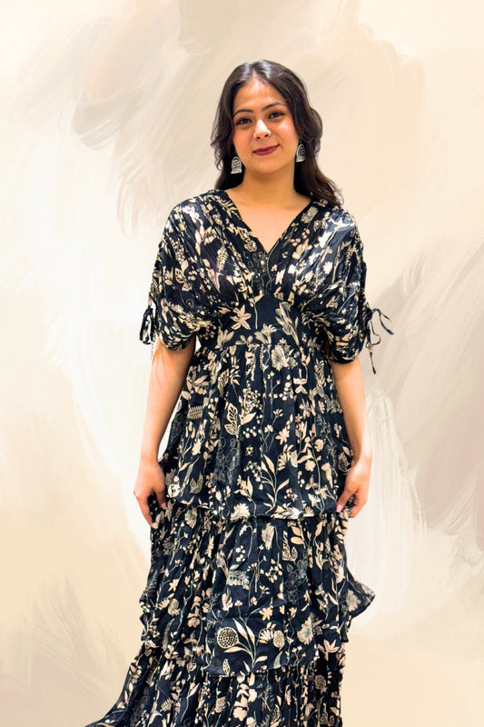 Regular price Rs. 5,695.00Regular priceUnit price / perSale price Rs. 5,695.00Boho Black Floral Tiered Dress