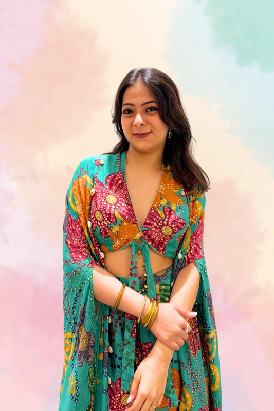 Regular price Rs. 12,995.00Regular priceUnit price / perSale price Rs. 12,995.00Teal Floral Indo Western Set