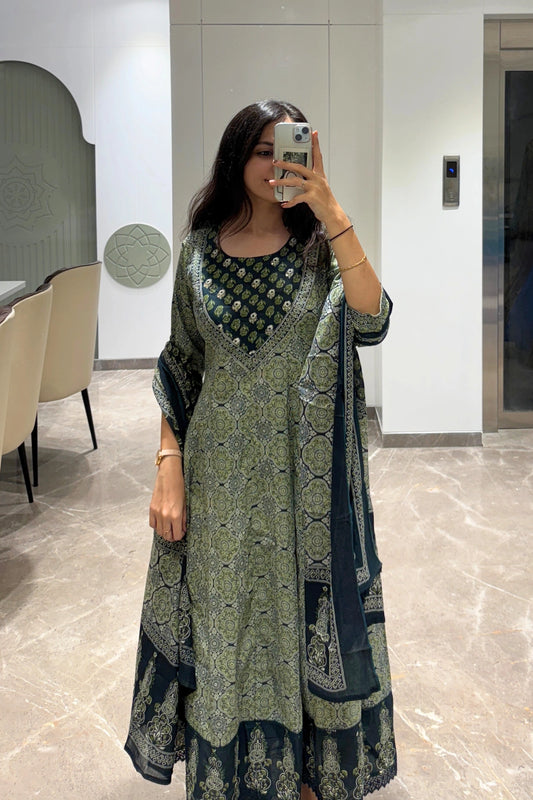 Regular price Rs. 2,295.00Regular priceUnit price / perSale price Rs. 2,295.00Emerald Enigma Printed Anarkali Set