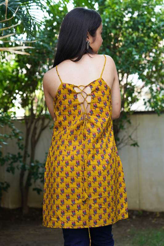 Mustard Botanical Sprig Print Spaghetti Kurti