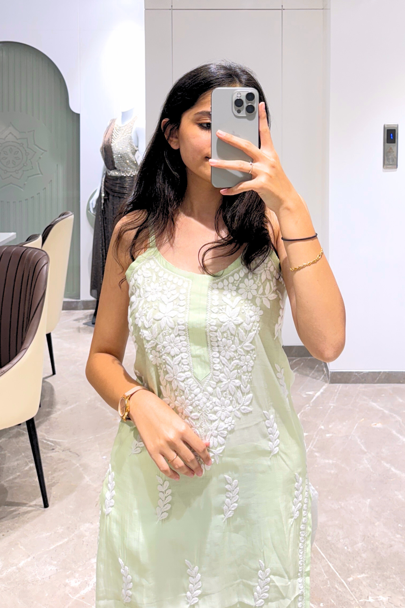 Top Details: Featuring a classic round neckline and three-quarter sleeves, the kurti is adorned with delicate tone-on-tone embroidery and wooden buttons. The straight cut flatters the silhouette, keeping it crisp yet breathable.