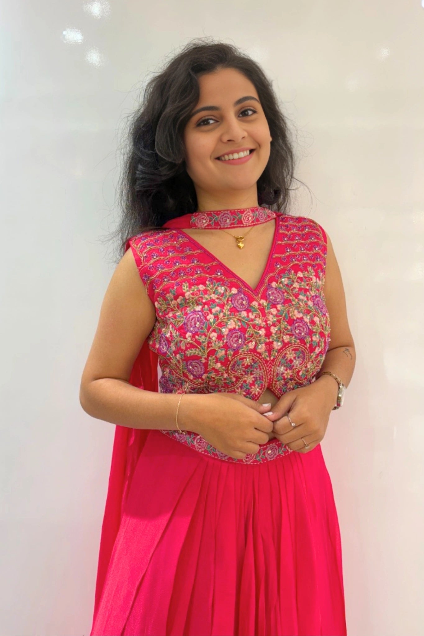 Bottom Details: A flowy, floor-length draped skirt pairs beautifully with the ornate top, creating a graceful and flowing silhouette.