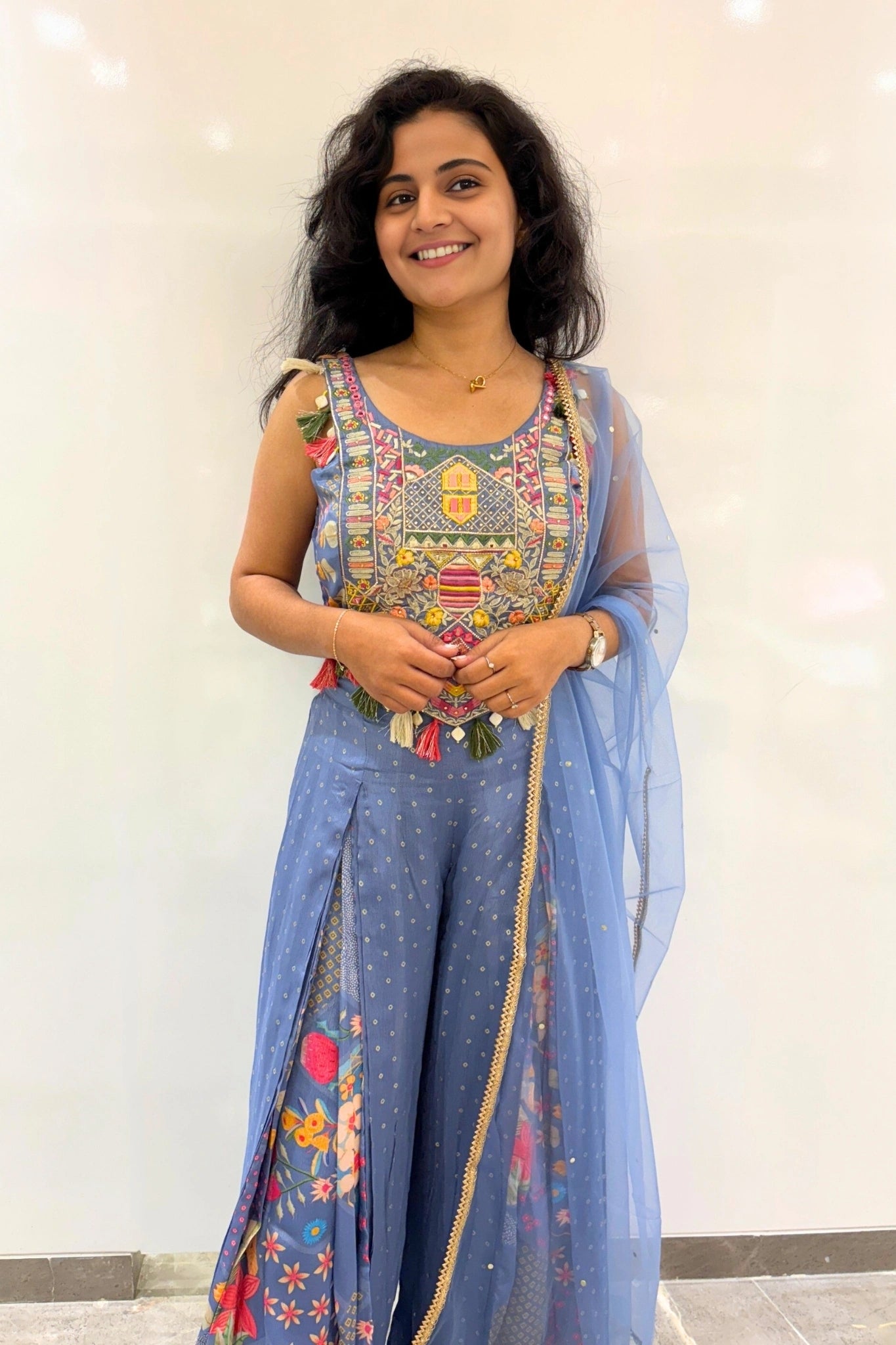 General Brief: This playful Indo-western outfit combines intricate mirror work, vibrant detailing, and breezy fabric, making it a perfect choice for daytime celebrations or festive occasions with a modern twist.